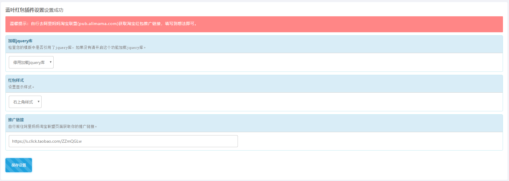 双11快要到了,淘宝又可以抢红包了,为了方便每天领取红包,于是做了这个EMLOG蓝叶红包插件,安装激活插件后,在页面上就会出现领取红包的图片按钮,点击进入每天领取三次红包;如果需要换成你自己的推广链接,请自行前往pub.alimama.com里获取红包推广链接,在插件设置界面里修改成你的推广链接即可;EMLOG蓝叶红包插件展示样式有两种,一种是居中弹出大图,一种是在右上角显示小图,根据个人喜好设置吧。