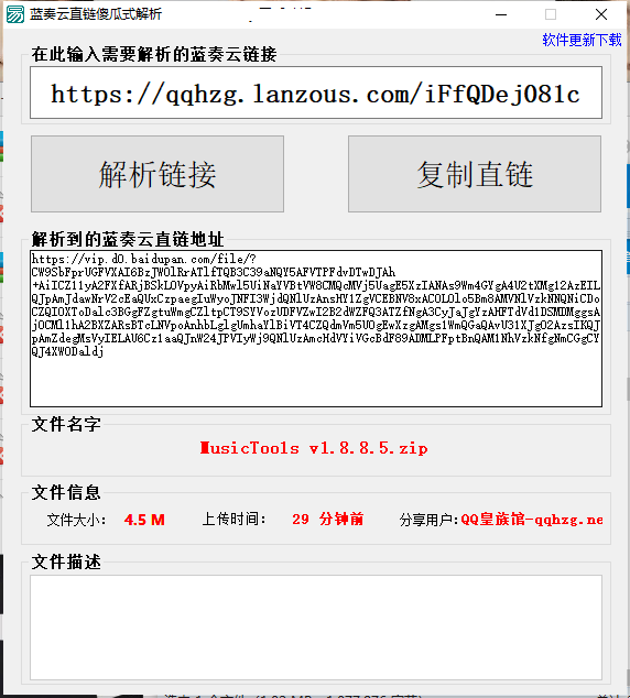 蓝奏云直链傻瓜式解析软件是一款简单的蓝奏云直链解析软件,只需要复制粘贴你需要解析的地址即可,能够帮助用户直接下载该链接中的文件,有需要的用户不要错过了,欢迎下载使用!