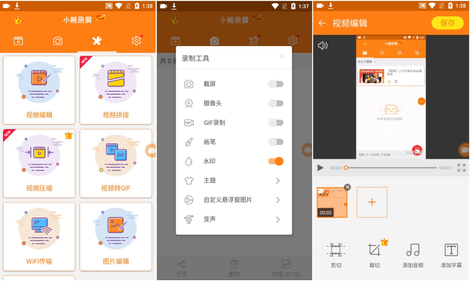 小熊录屏是一款稳定优质的录屏软件,录屏功能多;可以完成手机桌面录屏、手游录制、屏幕直播等;有视频编辑、视频拼接、视频压缩、视频转GIF、图片编辑等功能;打开后无需登陆直接使用即可,已解锁会员特权功能。