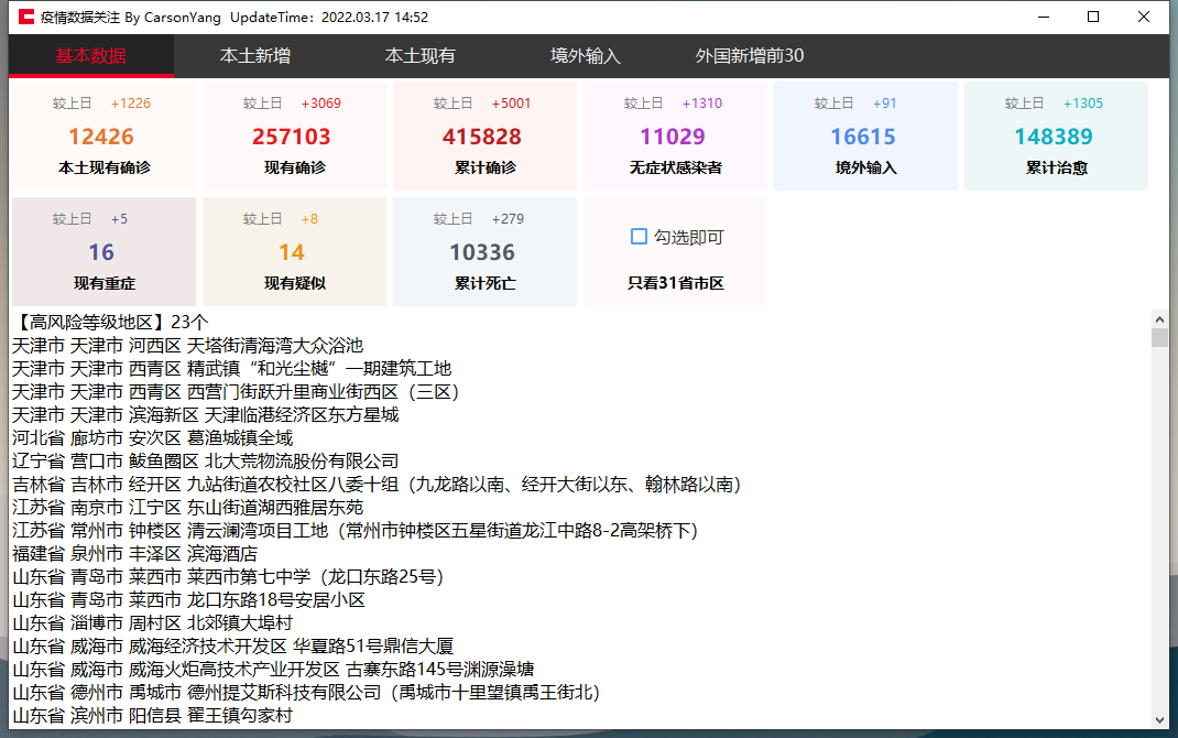 本次为大家分享的是疫情数据关注工具v7.0 可查风险地区详细