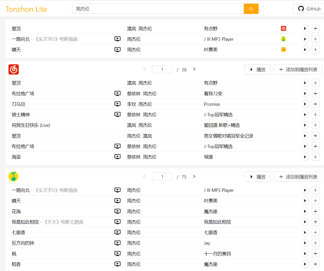 所以为小伙伴带来了最新的良心听歌平台【Tonzhon Lite】,已经在Github开源的小网站;
