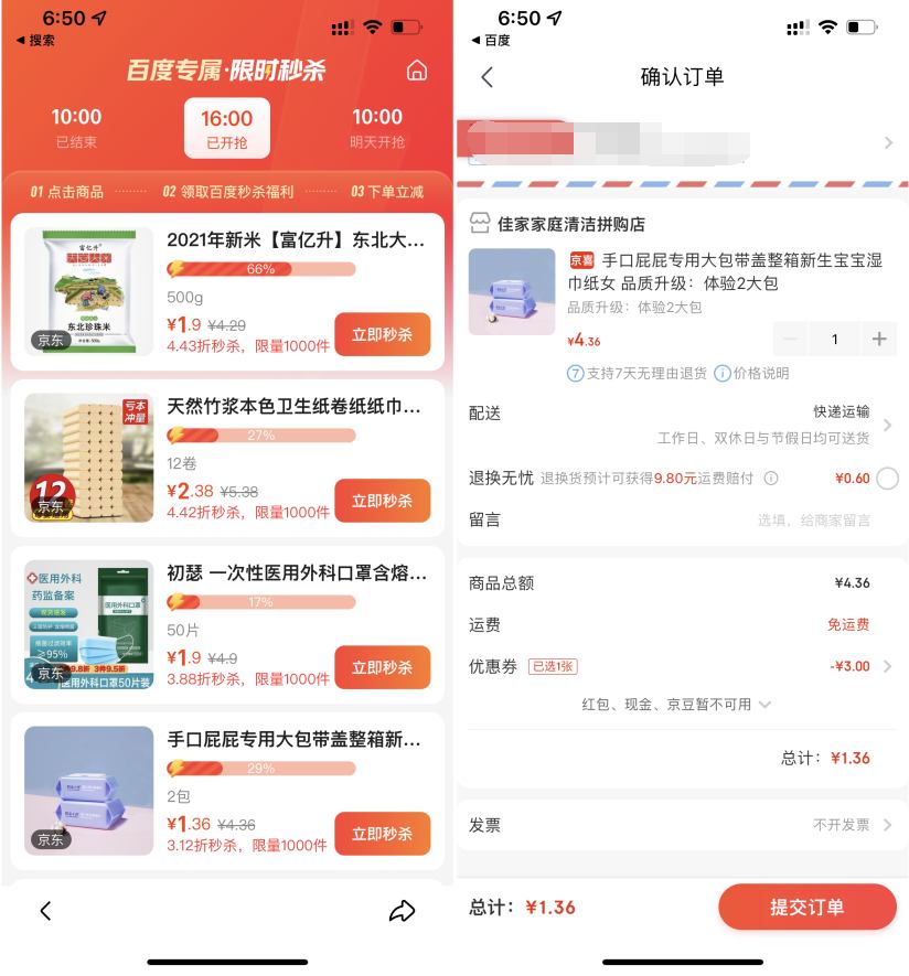 本文是在百度APP进入限时秒杀活动,里面的东西都是1块钱可以购买;其实就是在京东领券后可以1元购买,我们使用浦发银行支付会立减1元;自己实付0.01元就可以了,浦发银行2类电子账户也可以,大家可以撸一下。